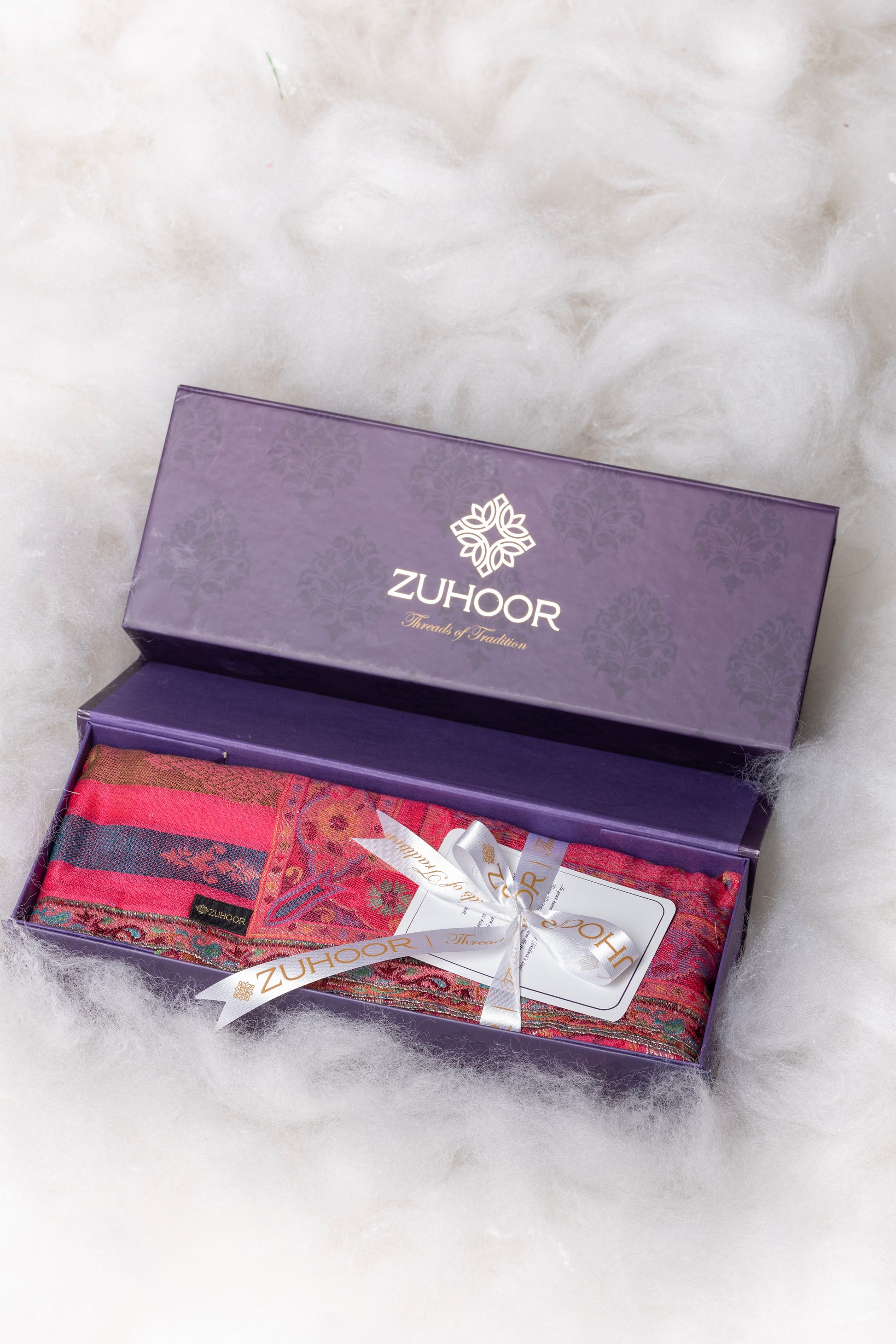 Zuhoor Classic Zari Stole: Pink Kashmiri zari with paisley floral motifs. Premium viscose for festive elegance and gifting.
