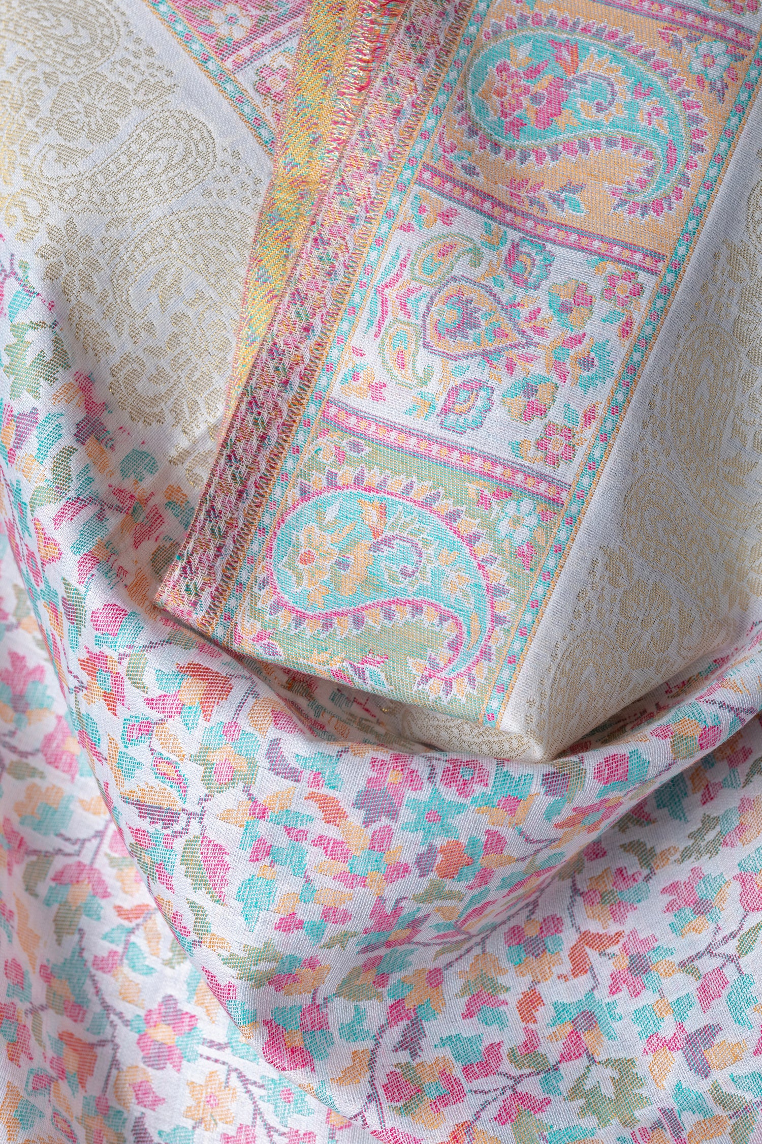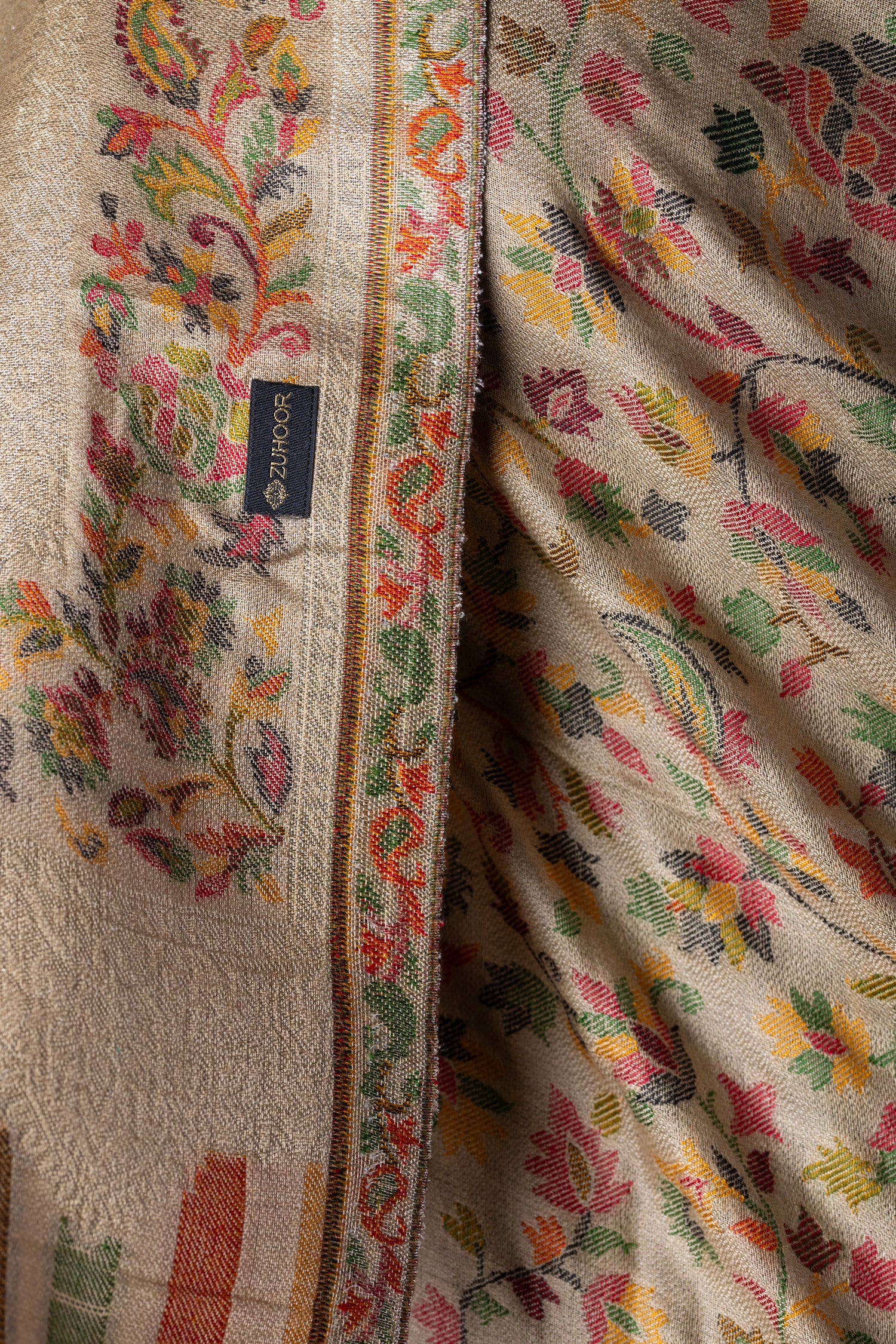 • Weave: Authentic Kashmiri zari with floral/paisley motifs